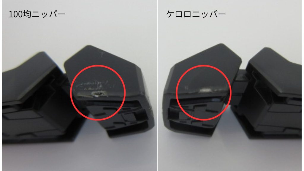 100均のニッパーは、主に針金等を切るための「工具」です。刃が鋭くないため、プラスチックを押しつぶして切るので、パーツの切断面に力がかかり白く変色(白化)したり、パーツを破損してしまうことがあります。